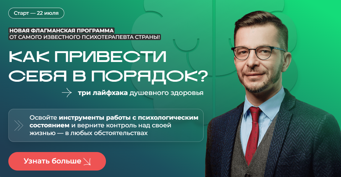 Присоединяйтесь к новому курсу Андрея Курпатова, изучайте, как работает ваша психика и меняйте своё психологическое состояние в лучшую сторону, чтобы стать сильнее, не бояться внешних перемен и чувствовать уверенность!