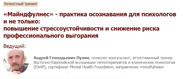 Андрей Геннадьевич Пулин, психолог-консультант, аттестованный тренер Восточно-Европейской ассоциации гипнотерапевтов и клинических психологов (ЕАНР), сертификат Mental Health Foundation, направление «mindfulness» (London, UK), стаж работы в телесно-ориентированном подходе – 30 лет.