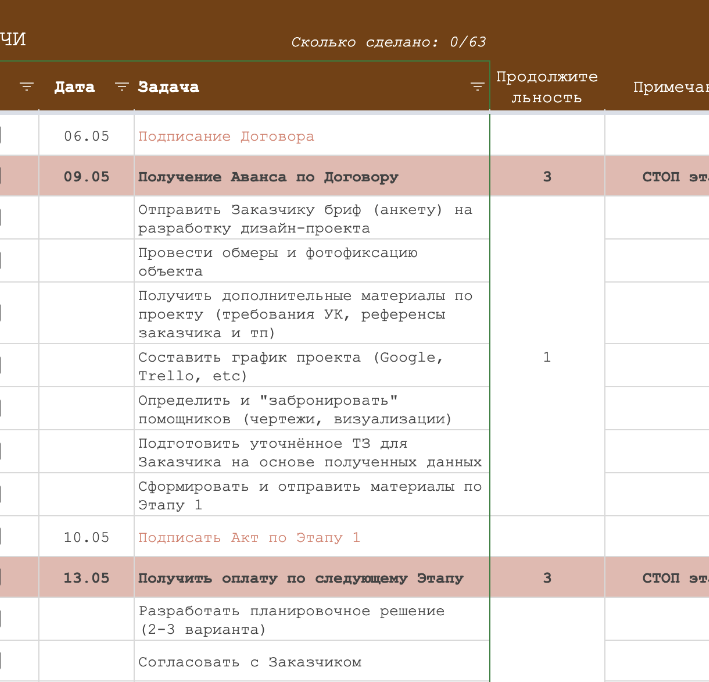 Документ совмещает в себе чек-лист по разработке дизайн-проекта и график-календарь с датами, сроками.