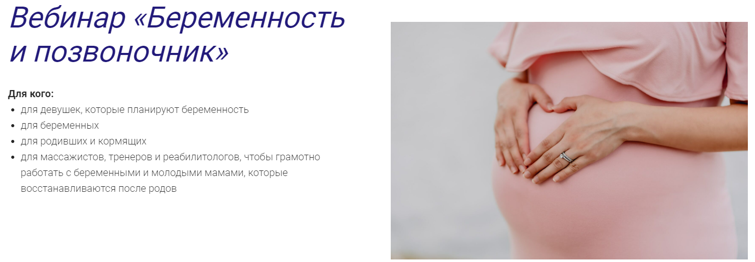 Этот вебинар поможет вам разобраться, что происходит с позвоночником в организме женщины во время беременности и родов, и научиться доступным языком объяснить, что нужно и можно делать в этот период. Вы можете использовать материалы вебинара, чтобы лучше помогать своим клиентам и пациентам.