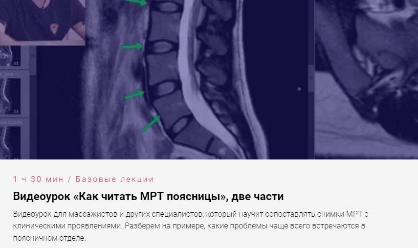 Видеоурок для массажистов и других специалистов, который научит сопоставлять снимки МРТ с клиническими проявлениями. Разберем на примере, какие проблемы чаще всего встречаются в поясничном отделе