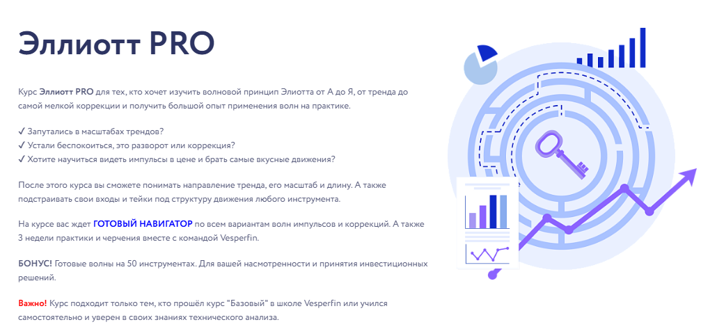Важно! Курс подходит только тем, кто прошёл курс "Базовый" в школе Vesperfin или учился самостоятельно и уверен в своих знаниях технического анализа.