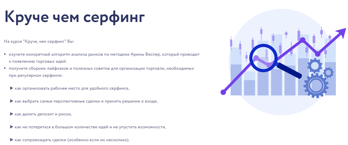 На курсе "Круче, чем серфинг" Вы: - изучите конкретный алгоритм анализа рынков по методике Арины Веспер, который приводит...vesperfin.com