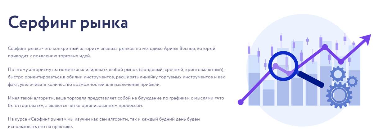 На курсе "Круче, чем серфинг" Вы: - изучите конкретный алгоритм анализа рынков по методике Арины Веспер, который приводит...vesperfin.com