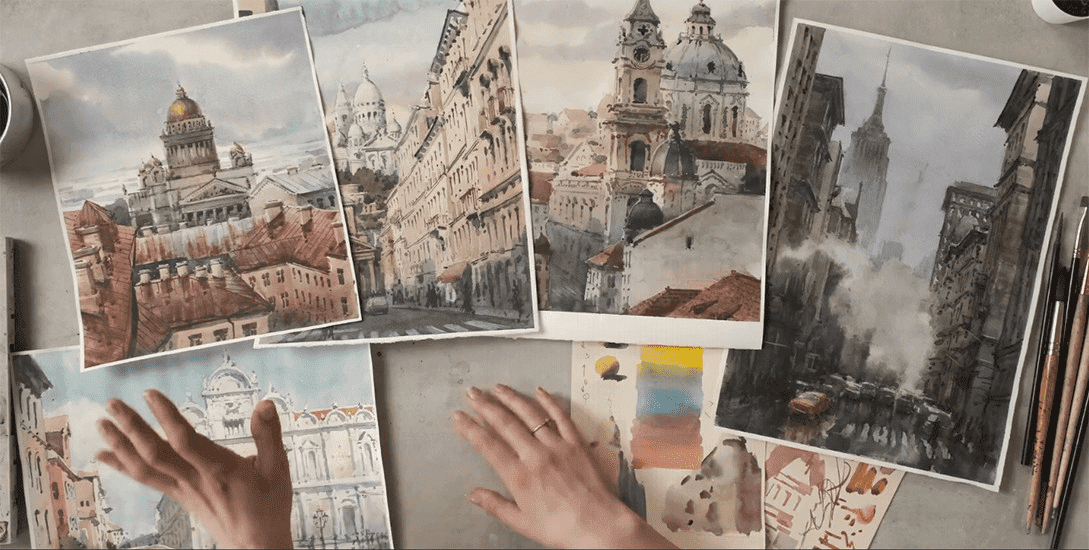 На курсе «Городские пейзажи» мы изучим особенности видов и ландшафтов в акварели, познакомимся воздушной перспективой, научимся изображать туман и передавать разные состояния неба, а также работать с ближним и дальним планами картины.