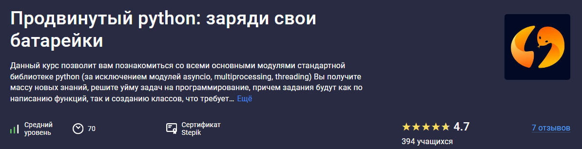 Данный курс позволит вам познакомиться со всеми основными модулями стандартной библиотеке python (за исключением модулей asyncio, multiprocessing, threading) Вы получите массу новых знаний, решите уйму задач на программирование, причем задания будут как по написанию функций, так и созданию...stepik.org