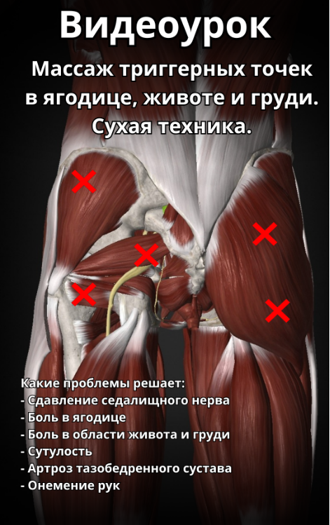 - Этот видеоурок подходит для устранения боли в ягодице, сдавлении седалищного нерва, боли в области живота и груди, ограничении подвижности грудной клетки, ограничении подвижности тазобедренного сустава и его артрозе