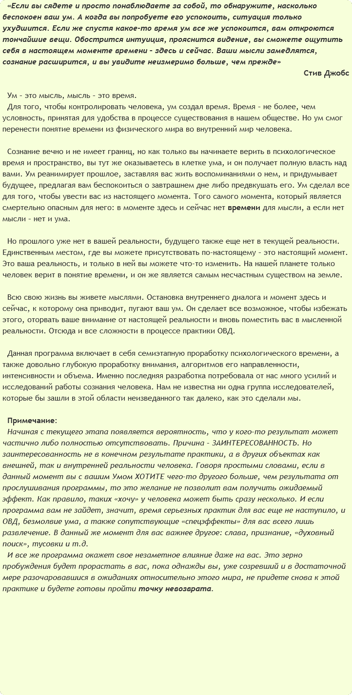 Данная программа включает в себя семиэтапную проработку психологического времени, а также довольно глубокую проработку внимания, алгоритмов его направленности, интенсивности и объема. Именно последняя разработка потребовала от нас много усилий и исследований работы сознания человека. Нам не известна ни одна группа исследователей, которые бы зашли в этой области неизведанного так далеко, как это сделали мы.