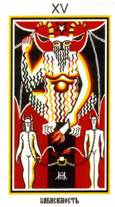 15 Аркан – "Дьявол". Яхболон (божество Тамплиеров) или Бафомёт. Карта показывает энергии, которыми мы привязаны к этому миру, это энергии Серебряной нити. Князь этого мира – Сатана, так вот он там и нарисован. Мы к этому миру прикованы цепью, которая на этой карте изображена. Сиддха этого аркана – оживление. Тот, кто владеет энергиями этого аркана, тот может вернуть человека в этот мир, восстановить Серебряную нить, воскресить покойника.