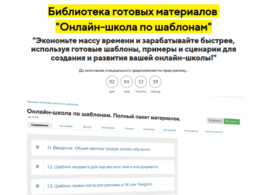 Итого, в комплекте «Онлайн-школа по шаблонам» вы получает всю коллекцию шаблонов, сценариев и примеров: