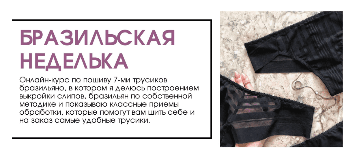 Задумывались о пошиве трусиков или уже начали этот увлекательный путь? Хочется разобраться с формой бразильяно, разными материалами и обработками? Тогда читайте дальше, ведь это приглашение на онлайн-курс "Бразильская неделька",