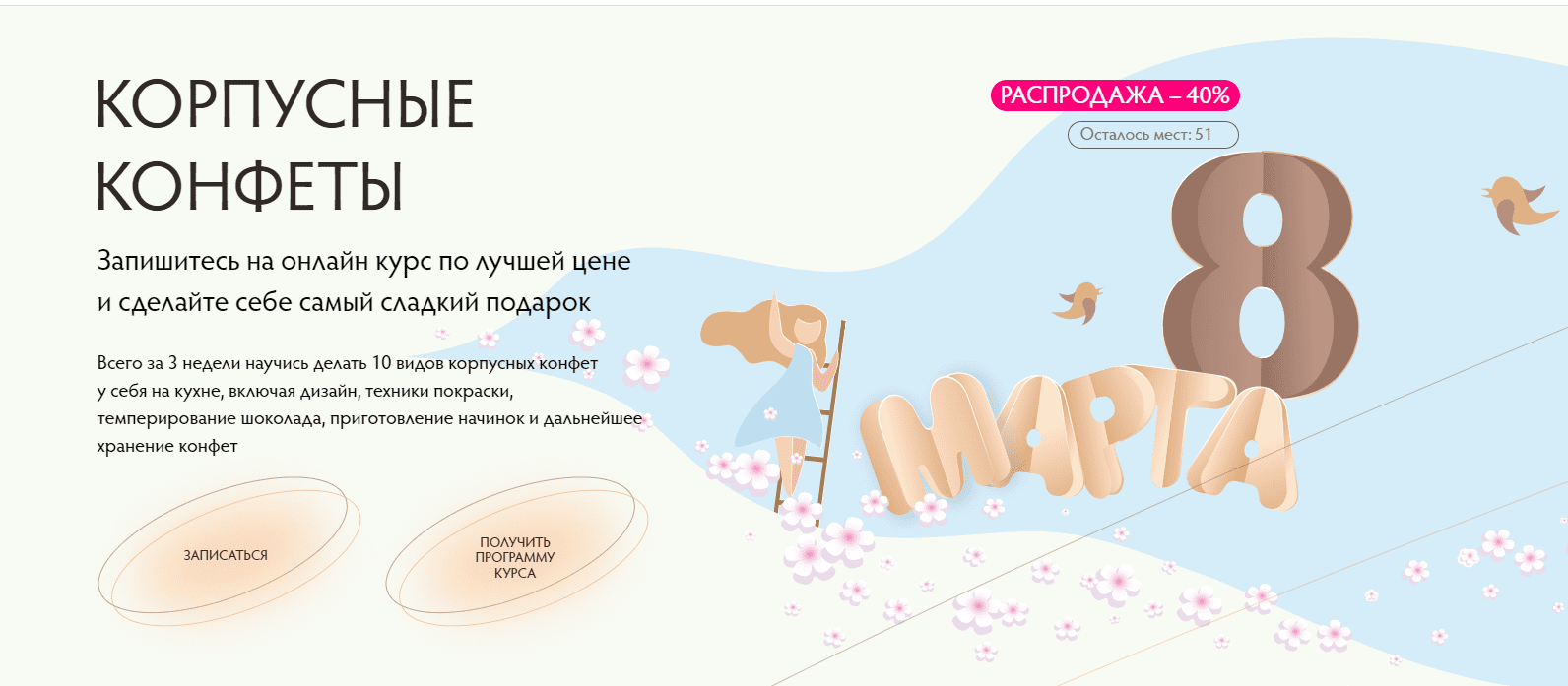Всего за 3 недели научись делать 10 видов корпусных конфет у себя на кухне, включая дизайн, техники покраски, темперирование шоколада, приготовление начинок и дальнейшее хранение конфет