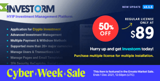 Investorm v1.1.5 Nulled является идеальным решением для управления вашей инвестиционной платформой HYIP. С Investorm вы можете настроить свою инвестиционную платформу за несколько часов без знаний программирования. На нем есть самая мощная панель настроек, с которой вы можете очень легко управлять всеми настройками.