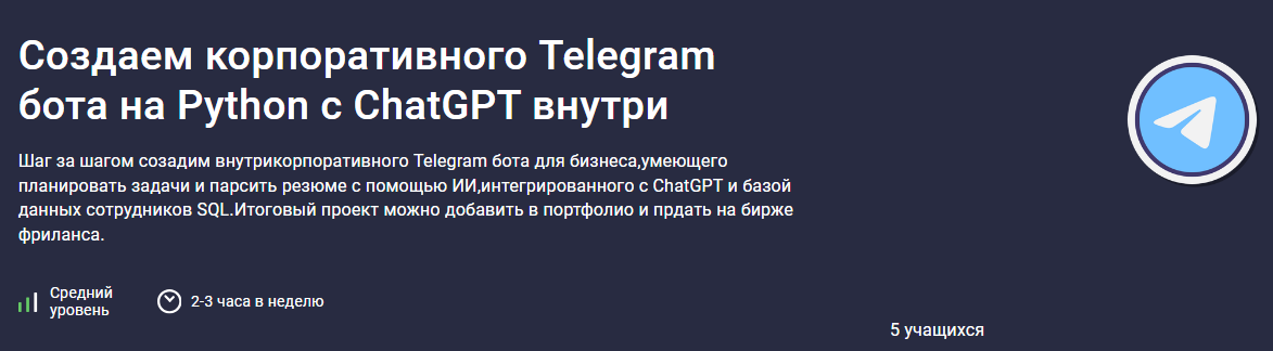 Шаг за шагом созадим внутрикорпоративного Telegram бота для бизнеса,умеющего планировать задачи и парсить резюме с помощью ИИ,интегрированного с ChatGPT и базой данных сотрудников SQL.Итоговый проект можно добавить в портфолио и прдать на бирже фриланса.stepik.org