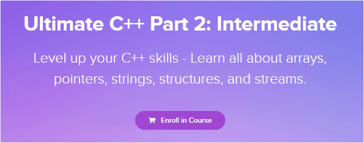 Повысьте уровень своих навыков C++ — узнайте все о массивах, указателях, строках, структурах и потоках. Чтобы пройти этот курс, вы должны были просмотреть первую часть или иметь полное представление о рассматриваемых в ней концепциях. Вы должны знать все о переменных, типах данных, операторах принятия решений, циклах и функциях.