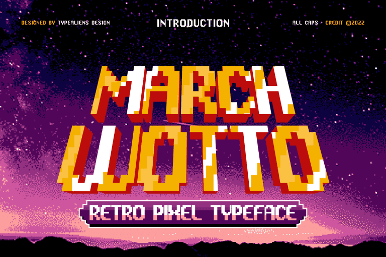 MARCH WOTTO - это обычный ретро-пиксельный шрифт для классических игр, шрифт, который в первую очередь является шрифтом без засечек, но модифицирован путем смешивания с квадратами или пикселями, чтобы сформировать уникальный дисплейный шрифт. Помимо шрифта для улучшения дизайна классических игр, этот шрифт также можно использовать в качестве заголовка журнала или таблоида, в котором обсуждаются игры. Он также может быть использован для названия фильма.