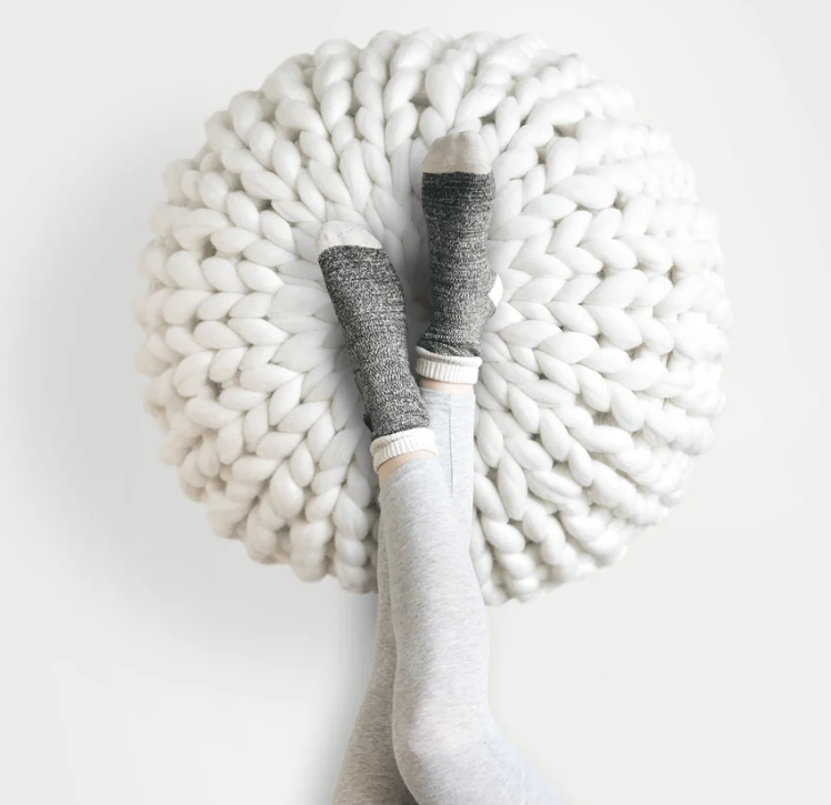 This hand knit pouf adds a fun statement piece to any room. The chunky yarn adds a cozy yet modern texture, and works up quite quickly.debrosse.com