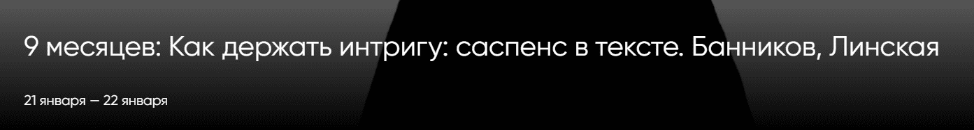 Вместе с Денисом Банниковым и Анной Линской разберетесь, что такое саспенс, как увлекать читателя и держать в состоянии напряжения в ожидании развязки.