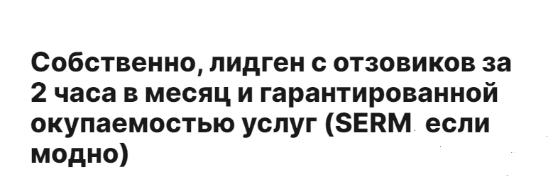 Собственно, лидген с отзовиков за 2 часа в месяц и гарантированной окупаемостью услуг (SERM, если модно)