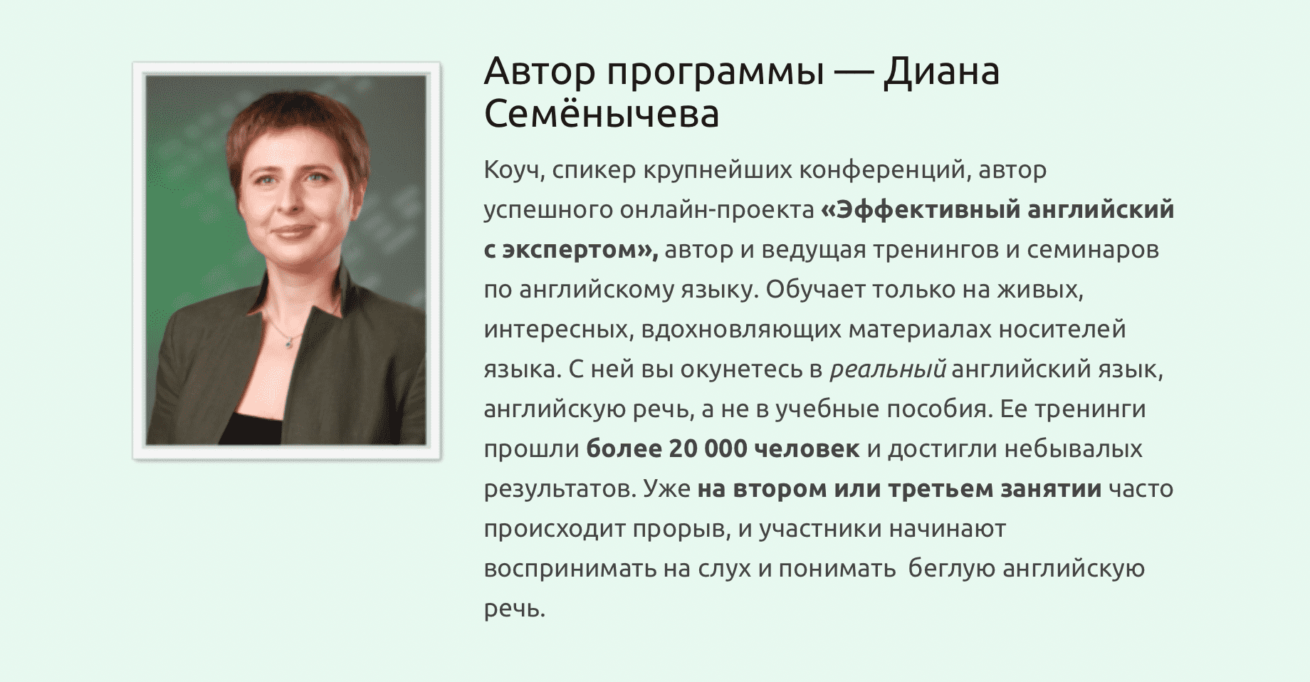 «Эффективный английский MAXIMUM» — это именно тот тренинг, который нужен вам, чтобы наконец-то отбросить все отговорки, почему вы до сих пор не знаете английского, и начать заниматься им по-настоящему. А за этим последуют настоящие результаты, которые не заставят себя ждать.