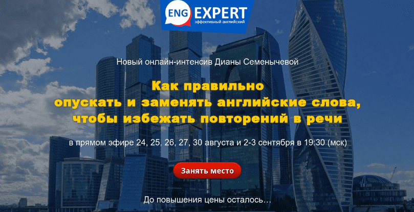 Записавшись сейчас на интенсив, вы получите ценный БОНУС – участие в новом 2-дневном интенсиве «Популярные разговорные выражения, без которых вам не обойтись», который состоится 2 и 3 сентября в 19:30 (мск).