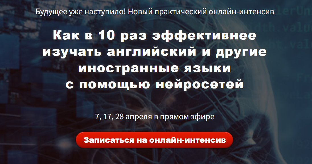 Тогда этот новый интенсив о том, как в 10 раз эффективнее изучать английский и другие иностранные языки при помощи новейших, прорывных технологий для вас!