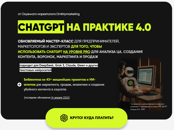 - Библиотека 45+ авторских промптов и AI-агентов для ChatGPT уровня PRO (для привлечения клиентов, создания контентов, маркетинга, бизнеса и т.д.);