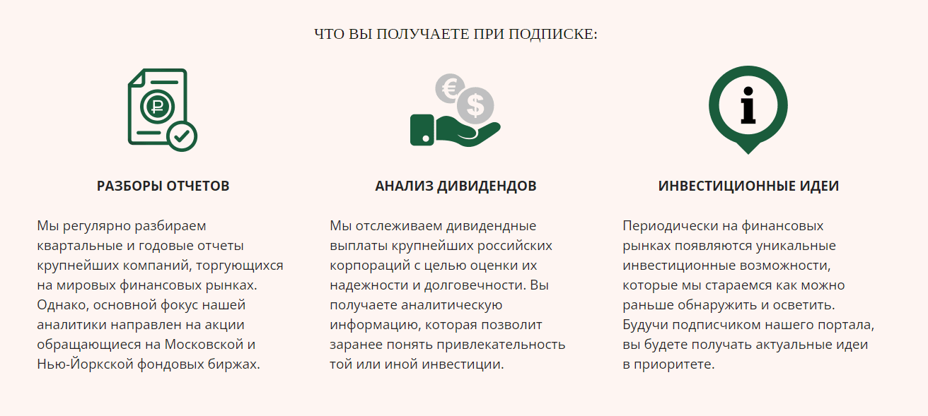 Материалы таких разделов как: Разбор отчетов компаний, Дивидендные истории, События на рынке, Инвестиционные идеи.