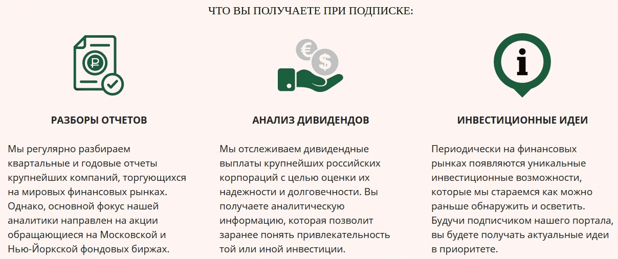 Материалы таких разделов как: Разбор отчетов компаний, Дивидендные истории, События на рынке, Инвестиционные идеи.
