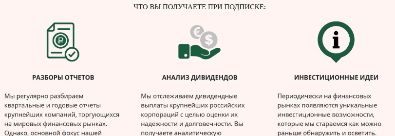 Материалы таких разделов как: Разбор отчетов компаний, Дивидендные истории, События на рынке, Инвестиционные идеи.
