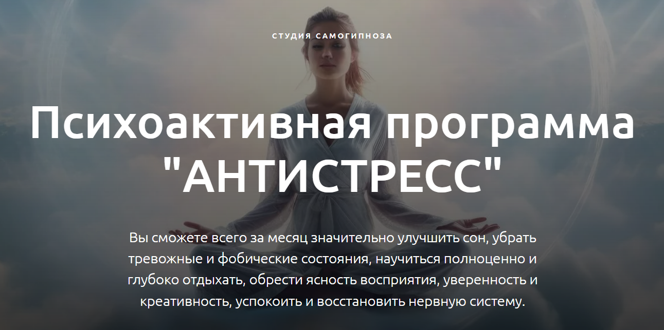 Программа «АНТИ-СТРЕСС» предназначена для тех, кто хотел бы получить эффективные навыки и инструменты для преодоления угнетающих депрессивных и тревожных состояний, улучшить психическое самочувствие, восстановить сон и нервную систему в целом. Программа «АНТИ-СТРЕСС» - это набор психоактивных...samogipnoz.com