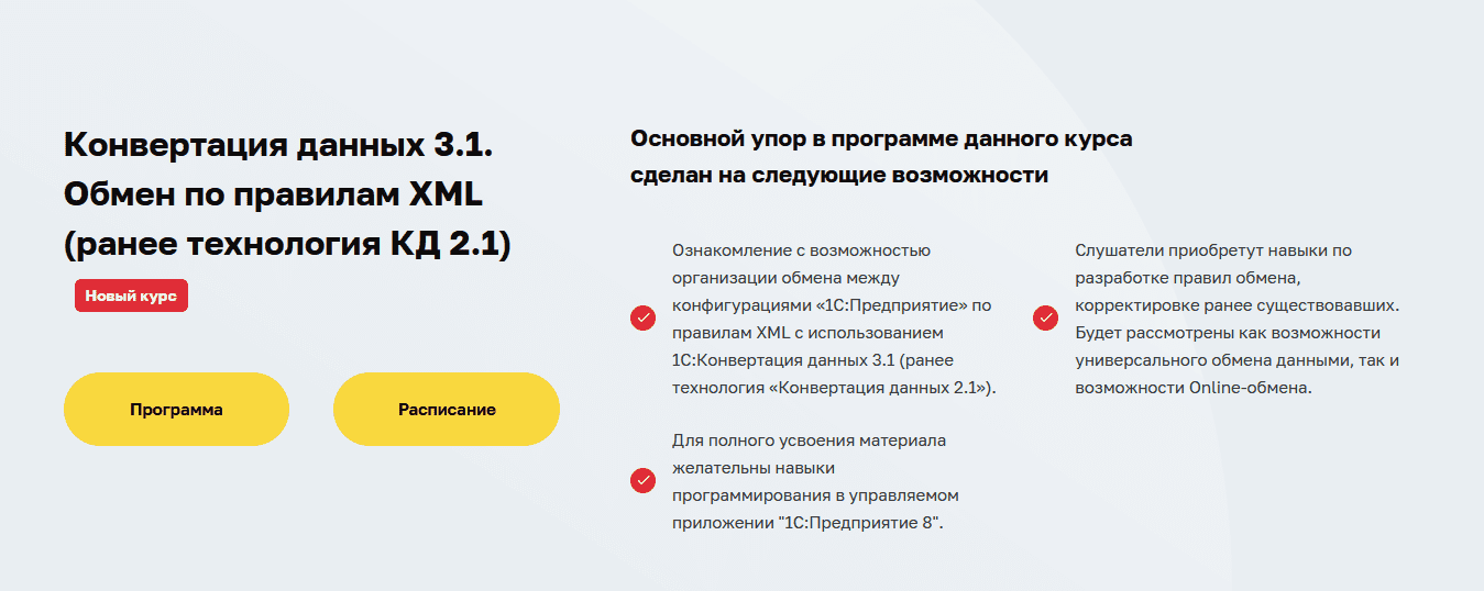 Курс предназначен для ознакомления с возможностью организации обмена между конфигурациями «1С:Предприятие» по правилам XML с использованием 1С:Конвертация данных 3.1 (ранее технология «Конвертация данных 2.1).