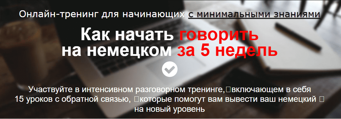 Онлайн-тренинг для начинающих с минимальными знаниямиКак начать говорить на немецком за 5 недельcheck-circleУчаствуйте в интенсивном разговорном тренинге,включающем в себя 15 уроков с обратной связью, которые помогут вам вывести ваш немецкий на новый уровеньОбзор тренинга и бонусного...de-speak.com