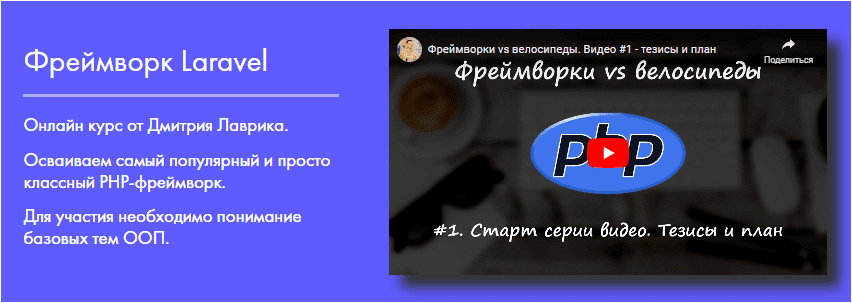 Осваиваем самый популярный и просто классный PHP-фреймворк. Курс предназначен для тех, кто: Освоил базу объектно-ориентированного программирования; Видит слишком много непонятного при чтении документации Laravel; Хочет освоить самый популярный и классный PHP-фреймворк.