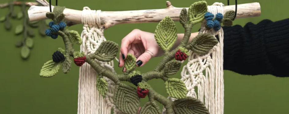 Learn to knot backdrops and sculptural 3D leaves and fruits using a variety of macramé techniques like the clove hitch and lark’s head