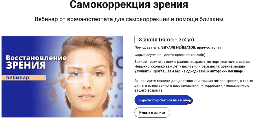 Зрение портится у всех в разном возрасте, но портится почти всегда. Неважно, сколько вам лет - десять или семьдесят, зрение можно улучшить. Приглашаем вас на однодневный авторский вебинар!