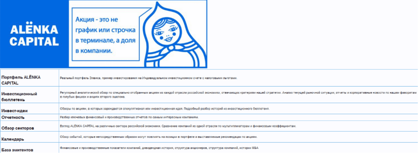 ALЁNKA CAPITAL впервые появилась в соцсети "ВКонтакте" в октябре 2013 года, как портфель акций от Элвиса Марламова, после выхода известной статьи «Алёнка и Сникерс». Это альтернативный подход к инвестированию на российском фондовом рынке, основанный на реальных фундаментальных показателях конкретных российских компаний, сделок M&A и здравом смысле, в противовес к повальному увлечению внешней макроэкономикой. Алёнка объединяет тех, кто считает, что акция - это доля в бизнесе, а не инструмент для биржевой игры. Очень важно, что в Алёнке не нервничают на спадах, коих было не мало в кризисных 2014-2015, а пользуются такими моментами для наращивания портфеля.