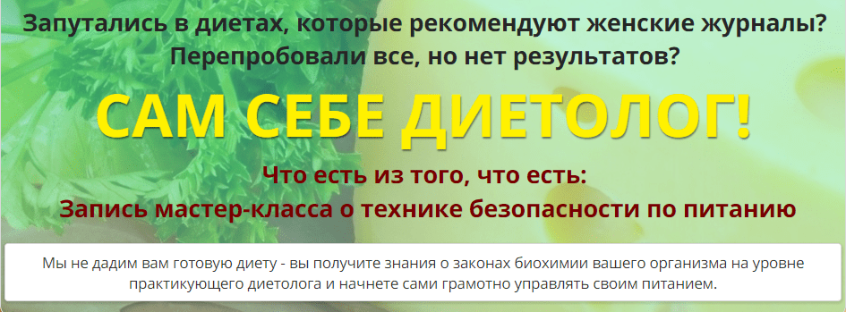 Мы не дадим вам готовую диету - вы получите знания о законах биохимии вашего организма на уровне практикующего диетолога и начнете сами грамотно управлять своим питанием.