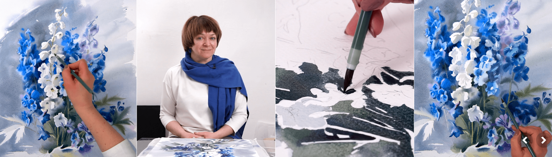 На этом цветочном весеннем мастер-классе по акварельной живописи Елена Базанова поделится с вами своим восхищением перед красотой ультрамариновых цветов дельфиниумов.