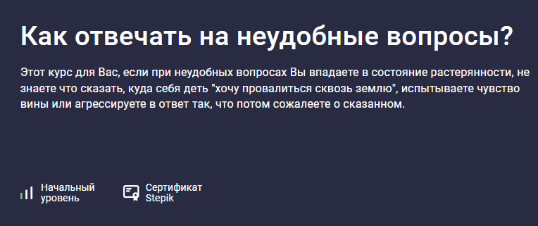 Этот курс для Вас, если при неудобных вопросах Вы впадаете в состояние растерянности, не знаете что сказать, куда себя деть "хочу провалиться сквозь землю", испытываете чувство вины или агрессируете в ответ так, что потом сожалеете о сказанном.stepik.org
