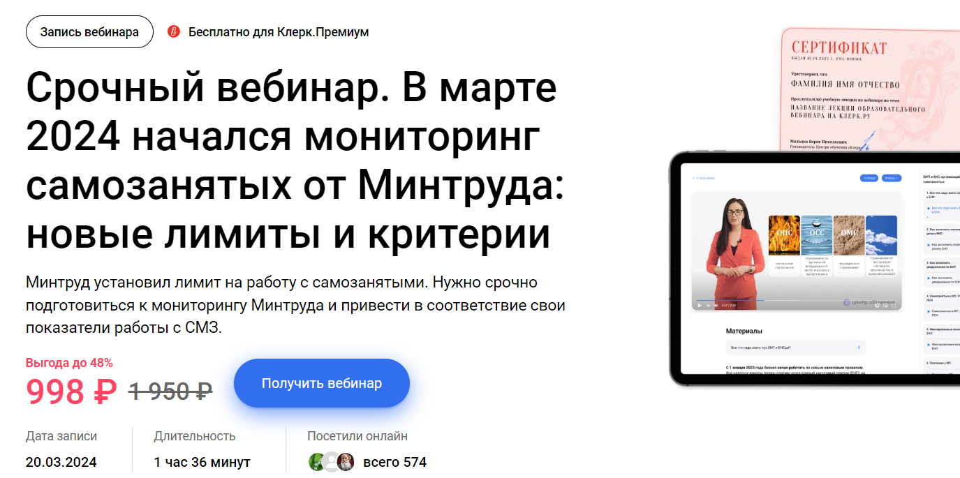 Срочный вебинар. В марте 2024 начался мониторинг самозанятых от Минтруда: новые лимиты и критерии. Онлайн обучение бухгалтеров — klerk.ru