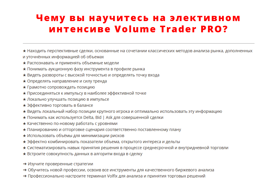 Volume Trader PRO — это самый полный Коучинг интенсив, целью которого является передача стратегии на срочном и фондовом рынках, профессиональная «закрытая» настройка платформы от лучших трейдеров команды VolFix.net. Двухмесячный элективный интенсив охватывает абсолютно все темы объемного анализа, включает в себя обучение комплексному подходу в комбинации с техническим и фундаментальным анализом по нашей методике, что идеально подходит для трейдеров, торгующих внутри дня и для среднесрочных инвесторов.