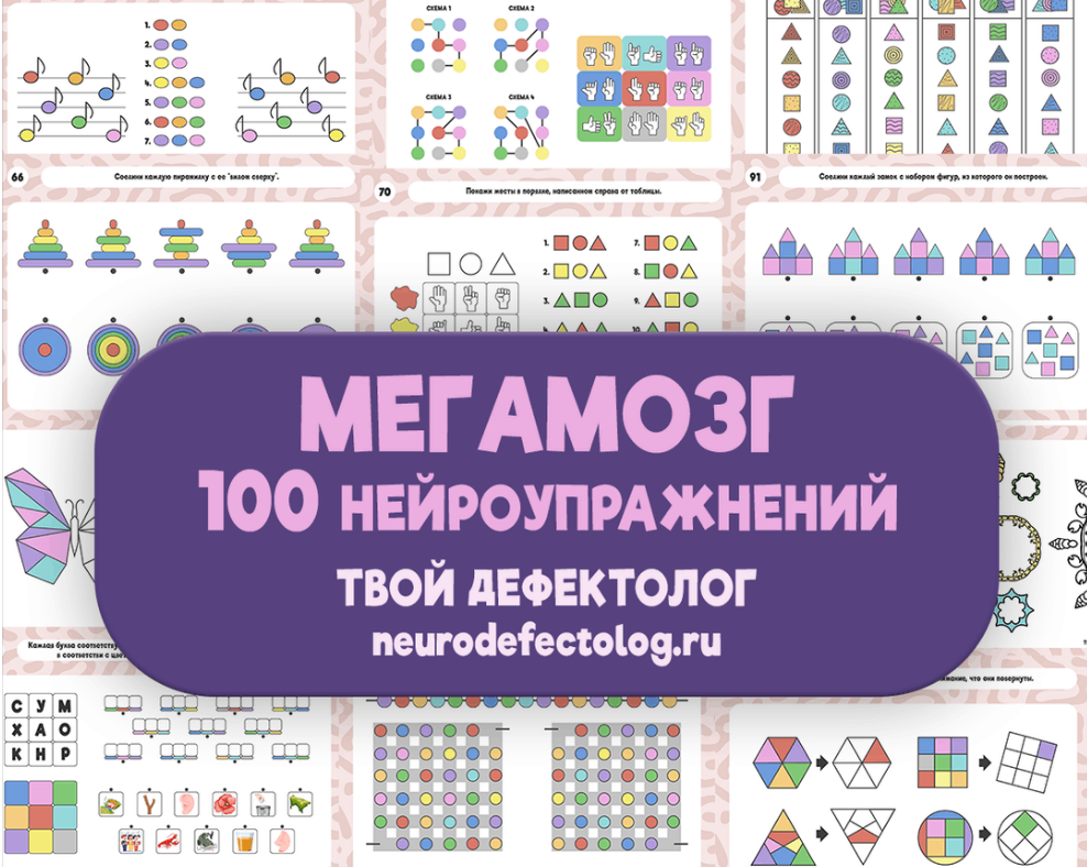 Сборник из 100 разнообразных нейропсихологических заданий для развития внимания, памяти, мышления, логики, пространственных представлений, двуручной координации, межполушарных связей.