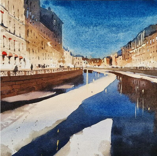 В основной части эфира напишем акварелью ночной вид на реку Мойка в Петербурге. Вместе с Ольгой поговорим о стадиях работы и о подборе цветов для ночного пейзажа. Выполним предварительный рисунок под акварель, руководствуясь правилами линейной перспективы. Перейдем к акварельным заливкам: разберемся с основными пятнами цвета и тона. Узнаем, как написать акварелью отражения огней и зданий в темной воде.