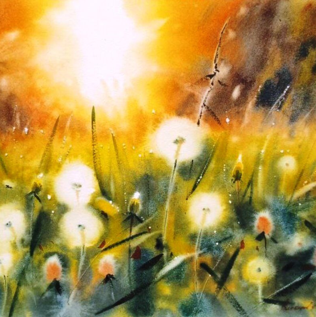 Как и с помощью каких акварельных приемов передать белизну и пушистую фактуру одуванчиков на свету?