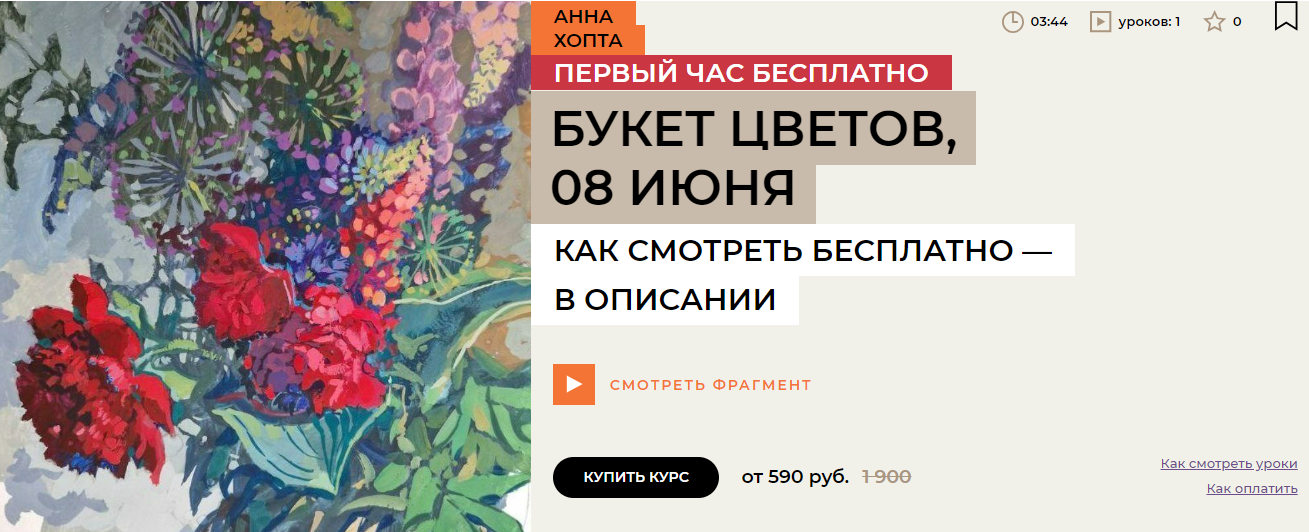 В первой бесплатной части урока напишем гуашью с натуры один цветок. В процессе поговорим об особенностях живописи гуашью на белом фоне: узнаем о нюансах изображения цветов в общей массе и одного отдельного цветка. В финале первой части урока Анна покажет, как покрывать работу лаком или клеем, чтобы сделать цвета ярче.