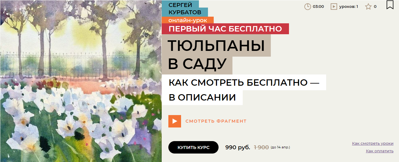 В первой бесплатной части урока Сергей расскажет об инверсии в акварели: на примере нескольких тюльпанов потренируемся выделять светлые цветы на темном фоне зелени и заставим бутоны сиять. В основной части урока напишем воздушный весенний пейзаж, где главным персонажем будет передний план с белыми тюльпанами.