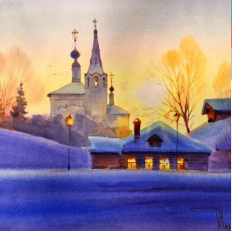 В основной части эфира нарисуем полноцветный большой пейзаж с элементами архитектуры. Поймем, как передавать рефлексы морозного утра на снегу и объектах пейзажа. Разберем, как писать акварелью архитектуру силуэтно. Поговорим о разности температуры цвета и как её использовать в своих работах.