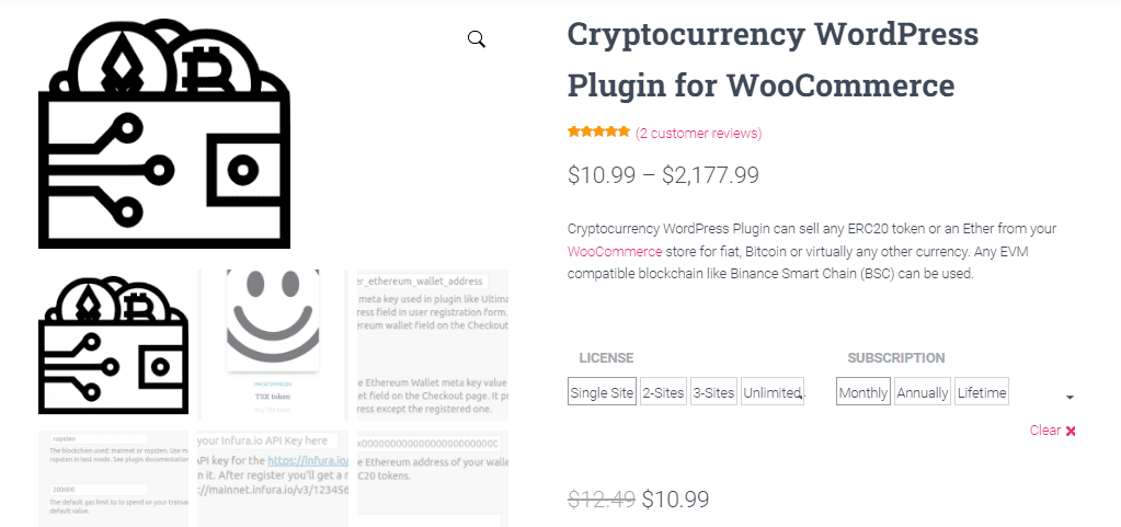 Криптовалютный плагин WordPress может продавать любой токен ERC20 или эфир из вашего магазина WooCommerce за фиат, биткойн или практически любую другую валюту. Можно использовать любой совместимый с EVM блокчейн, такой как Binance Smart Chain (BSC).