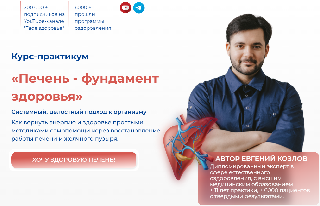 Этот практикум для всех, кто хочет получить теоретические и практические навыки по оздоровлению и профилактике печени и желчного пузыря за руку с автором Youtube-канала «Твое здоровье» (200 тыс. подписчиков) Евгением Козловым.
